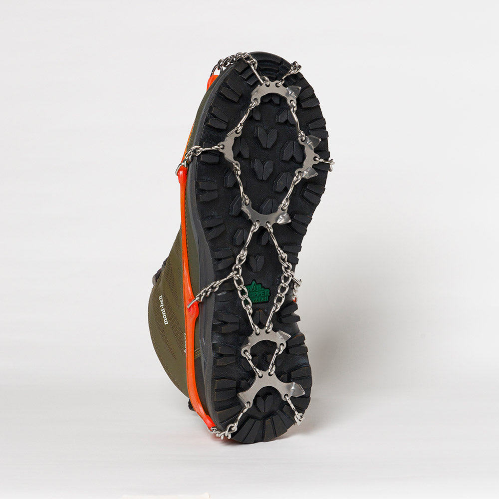 Enhance your grip and stability on icy terrain with these easy-to-attach traction cleats. Featuring rust-resistant stainless steel spikes strategically placed for optimal coverage, they provide confident footing on glaciers, icy trails, and snowy surfaces. The flexible design with elastic band and chain construction ensures a natural feel and secure fit on any footwear.
